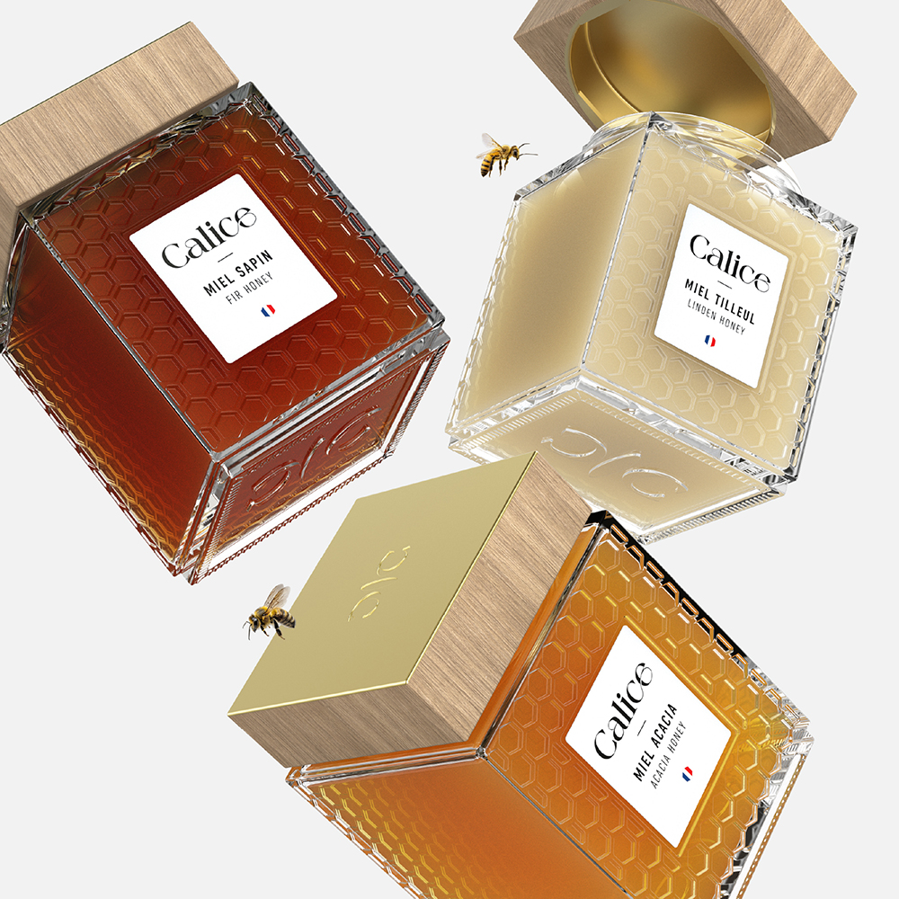 L’OR DES ABEILLES, PRÉSERVÉ DANS UN VERRE FAÇONNÉ COMME LEURS ALVÉOLES, SCELLÉ DE BOIS ET DE MÉTAL. UN EXERCICE DE STYLE POUR UN MIEL HAUT DE GAMME.